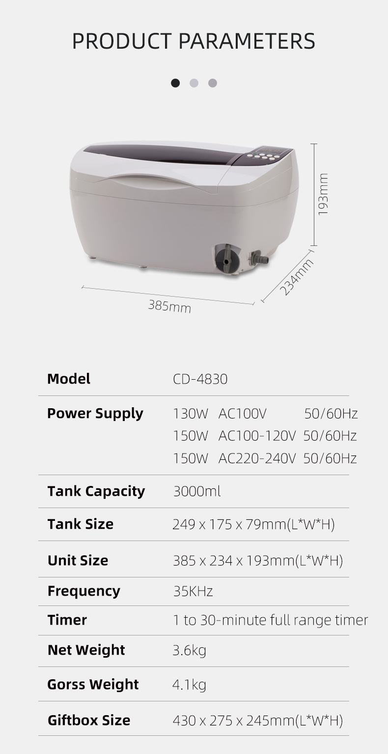 - 3.0L SUS304 nerūsējošā tērauda tīrīšanas tvertne, maksimālais priekšmeta garums, kas var iekļauties: 266 mm.