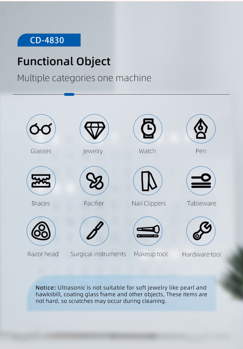 - Piemērots nagu salonu instrumentu, rotaslietu apstrādes produktu, zobārstniecības instrumentu tīrīšanai un citiem mērķiem.