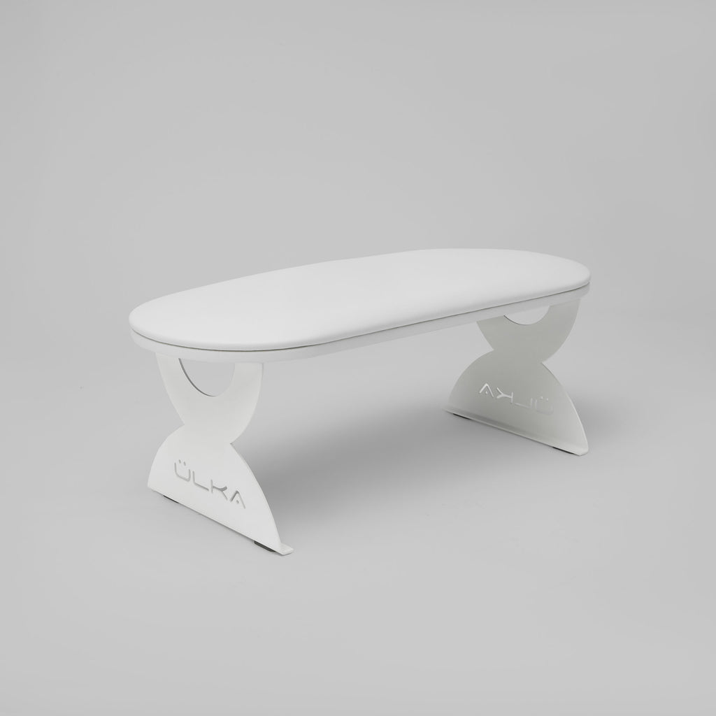 Roku balsts ar stilīgām metāla kājiņām un plašu spilvenu, kas izgatavots no augstas kvalitātes eko-ādas – viegli tīrāms un dezinficējams.