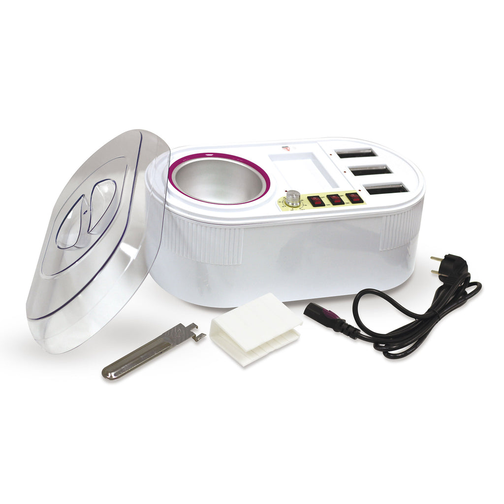 Weißer 1-Dosen-Heizer mit Thermostat und Netzindikator und 3 Kartuschenheizern, wobei jeder Kartuschenheizer mit einem separaten Schalter ausgestattet ist, verfügt über einen Kunststoff-Kartuschenhalter und einen Metall-Dosenhalter, um die Hände vor Verbrennungen zu schützen. Der Heizer hat eine Kunststoffabdeckung, die das Wachs vor Staub schützt.