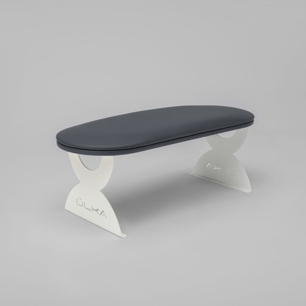 Armstütze mit stilvollen Metallfüßen und einem breiten Kissen, gefertigt aus hochwertigem Öko-Leder – leicht zu reinigen und zu desinfizieren.